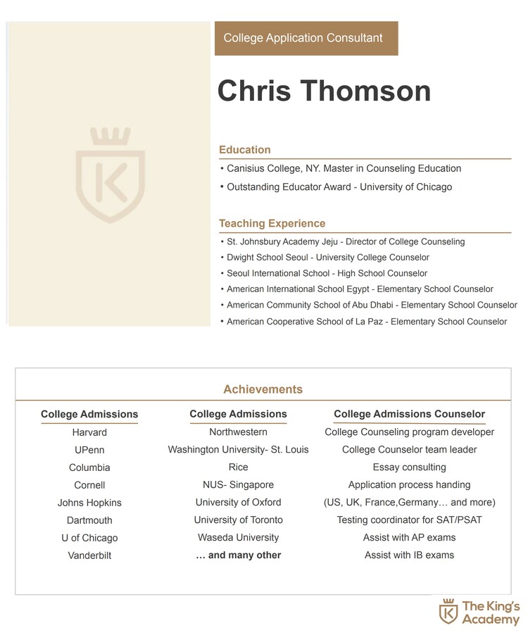 ** 홈페이지에 리트스된 선생님들 이외에 별도의 아이비리그 출신 사립학교 및 유명 학원 근무15년 경력 이상의 consultant분들께 상담 가능하니 별도로 문의 바랍니다.